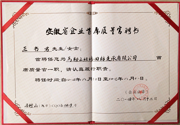 2014年8月12日上午,當(dāng)涂縣首席質(zhì)量官聘書(shū)頒發(fā)儀式在縣市場(chǎng)監(jiān)督管理局9樓會(huì)議室舉行,省質(zhì)監(jiān)局質(zhì)量處處長(zhǎng)、省質(zhì)量協(xié)會(huì)秘書(shū)長(zhǎng)、當(dāng)涂縣副縣長(zhǎng)、馬鞍山市質(zhì)量技術(shù)監(jiān)督局質(zhì)量科科長(zhǎng)到會(huì)祝賀,經(jīng)緯支承公司法人兼董事長(zhǎng)楊世宏以及10家法人代表出席會(huì)議。