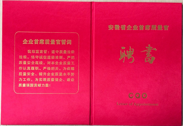 公司董事長(zhǎng)楊世宏在頒發(fā)儀式上向公司總經(jīng)理助理王書(shū)君頒發(fā)了首席質(zhì)量官任職聘書(shū)。隨后,公司總經(jīng)理助理王書(shū)君帶領(lǐng)當(dāng)涂縣第一批首席質(zhì)量官宣誓就職。