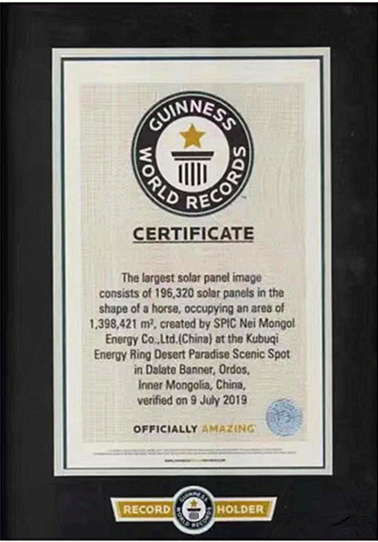 日前,由中國(guó)能建集團(tuán)承建,經(jīng)緯公司獨(dú)家提供核心裝置的內(nèi)蒙古鄂爾多斯市達(dá)拉特旗庫(kù)布齊沙漠光伏“駿馬”電站,通過吉尼斯世界紀(jì)錄認(rèn)證,成為世界上最大的光伏板圖形電站。同時(shí),該圖形電站還被收入吉尼斯即將出版的《中國(guó)驕傲70年》新中國(guó)成立70周年特別版圖書。