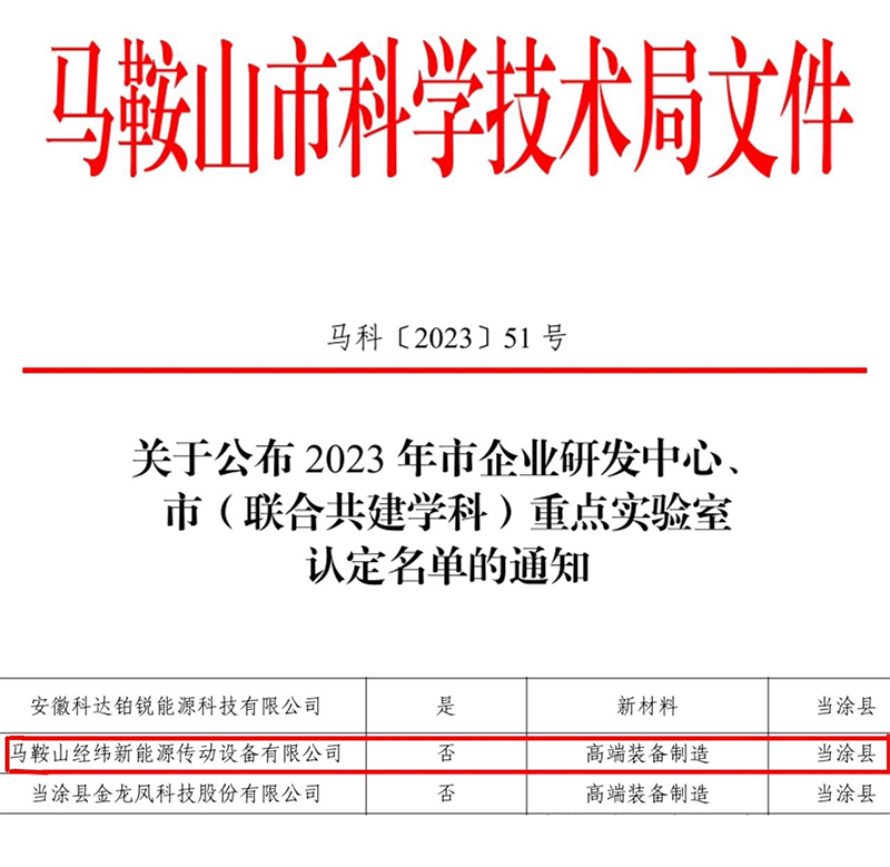 近日,根據(jù)《馬鞍山市企業(yè)研發(fā)中心認(rèn)定管理辦法(試行)》(馬科[2023]43號(hào))和《馬鞍山市(聯(lián)合共建學(xué)科)重點(diǎn)實(shí)驗(yàn)室認(rèn)定管理辦法》》(馬科〔2023]44號(hào))要求,經(jīng)推薦申報(bào)、形式審查、專家評(píng)審等程序,馬鞍山經(jīng)緯新能源傳動(dòng)設(shè)備公司被成功認(rèn)定為2023年市企業(yè)研發(fā)中心。