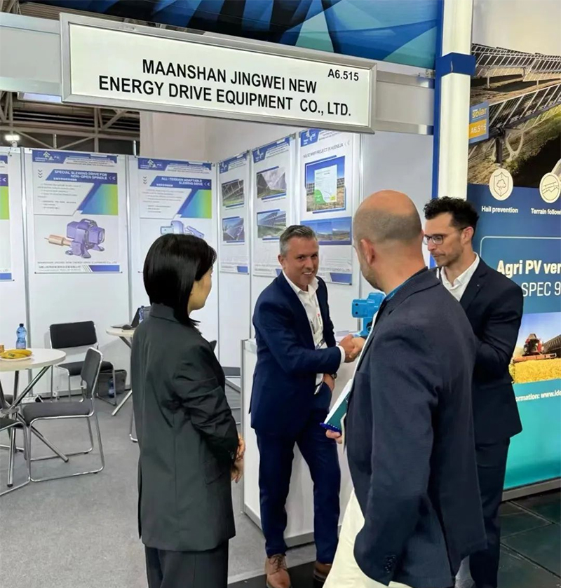 在本屆慕尼黑展會上,身臨現(xiàn)場的經(jīng)緯外貿(mào)和技術(shù)團(tuán)隊為全球客戶奉上了經(jīng)緯近年來不斷創(chuàng)新而生,并適用于全球市場的JV6B、JL6A、JM8、JV7等系列回轉(zhuǎn)減速機,這些分為平單軸單點驅(qū)動減速機和機械連桿式多點驅(qū)動用減速機等多種機型產(chǎn)品,都具有雙層骨架油封、氣密性在線全檢、零部件電泳處理、整體噴涂、長期耐候可靠性高、防護(hù)等級IP66,以及結(jié)構(gòu)簡單、減速比大、電機轉(zhuǎn)矩小、傳動管連接更加安全和耐高溫、高鹽度等優(yōu)良指標(biāo)。