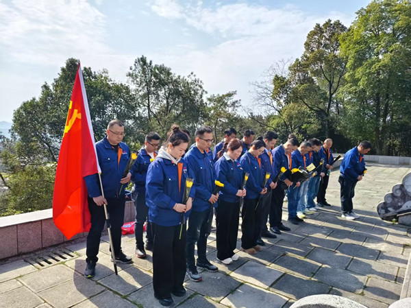 活動(dòng)伊始,全體黨員身著整潔的工裝并佩戴黨徽,神情莊重地來(lái)到烈士紀(jì)念碑前,整齊列隊(duì),向皖南事變中英勇?tīng)奚挠⒘覀兡е戮?,表達(dá)對(duì)先烈們深切的哀思。隨后,黨員們又依次向烈士紀(jì)念碑獻(xiàn)花,用鮮花寄托對(duì)烈士們的無(wú)限緬懷。此刻,在陽(yáng)光的照耀下,一枚枚鮮艷的黨徽仿佛訴說(shuō)著黨員們的使命與擔(dān)當(dāng),一朵朵金黃盛開(kāi)的菊花仿佛先烈們的崇高精神永遠(yuǎn)在我們心中綻放。